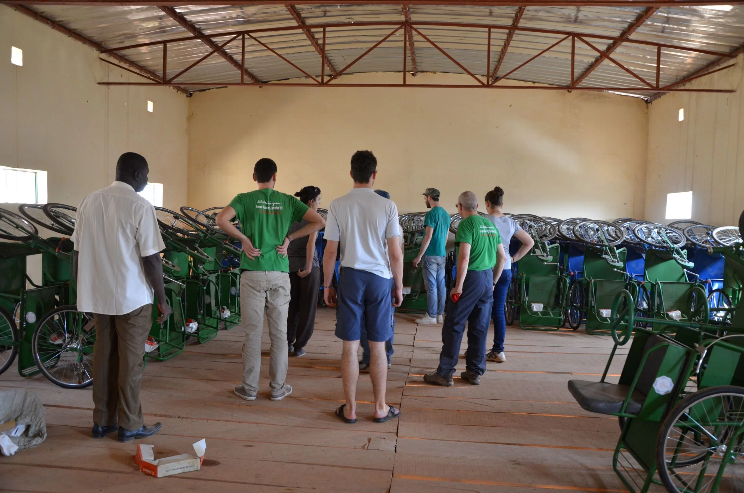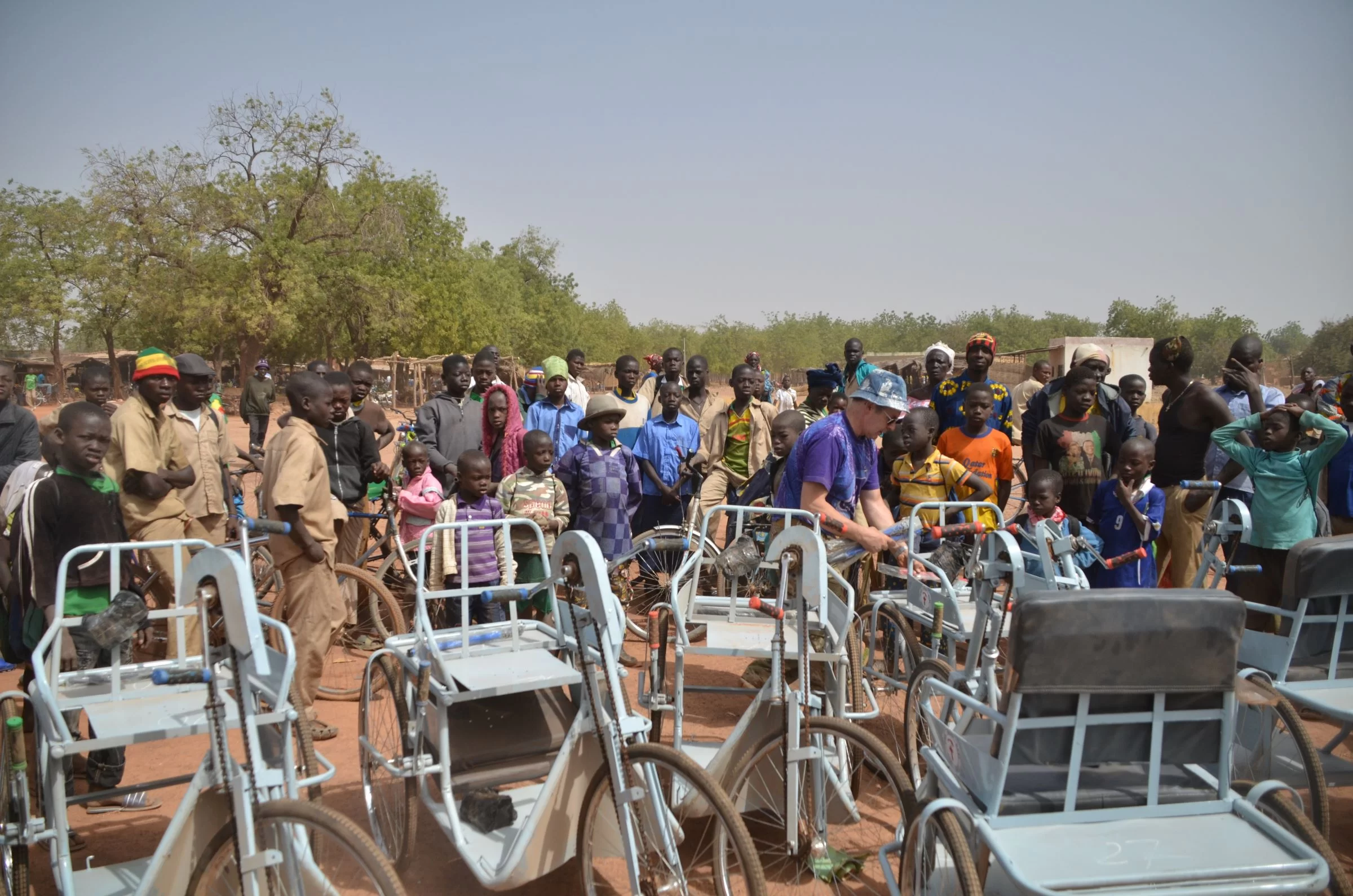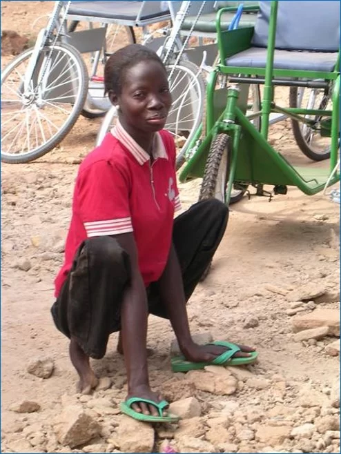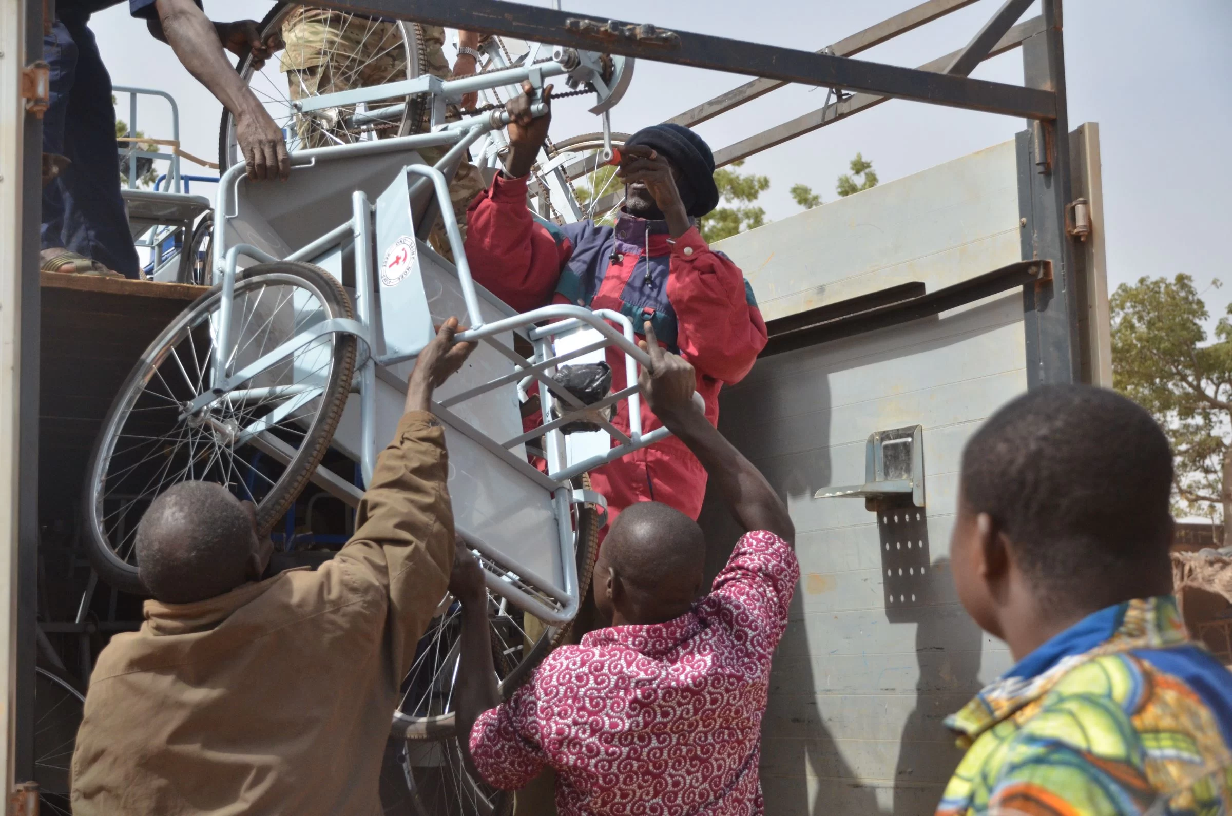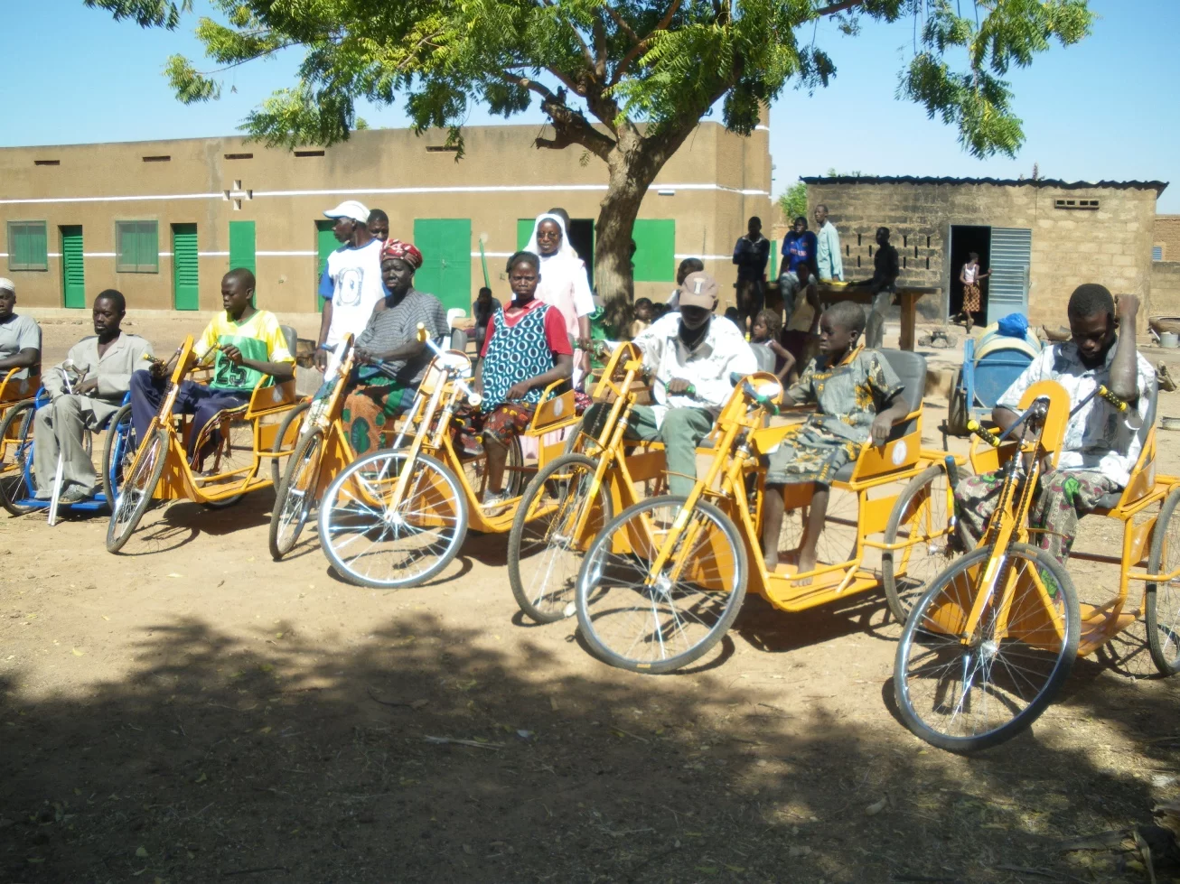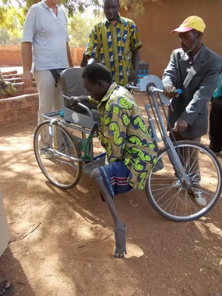 Le carrozzine hanno lo scopo prima di tutto di sollevare da terra le persone disabili, spesso vittime della poliomielite, prive dell’uso degli arti inferiori. Vengono realizzate da un artigiano di Ouagadougou, la capitale burkinabé, e possono essere di tre tipologie, a seconda del grado di funzionalità degli arti superiori: