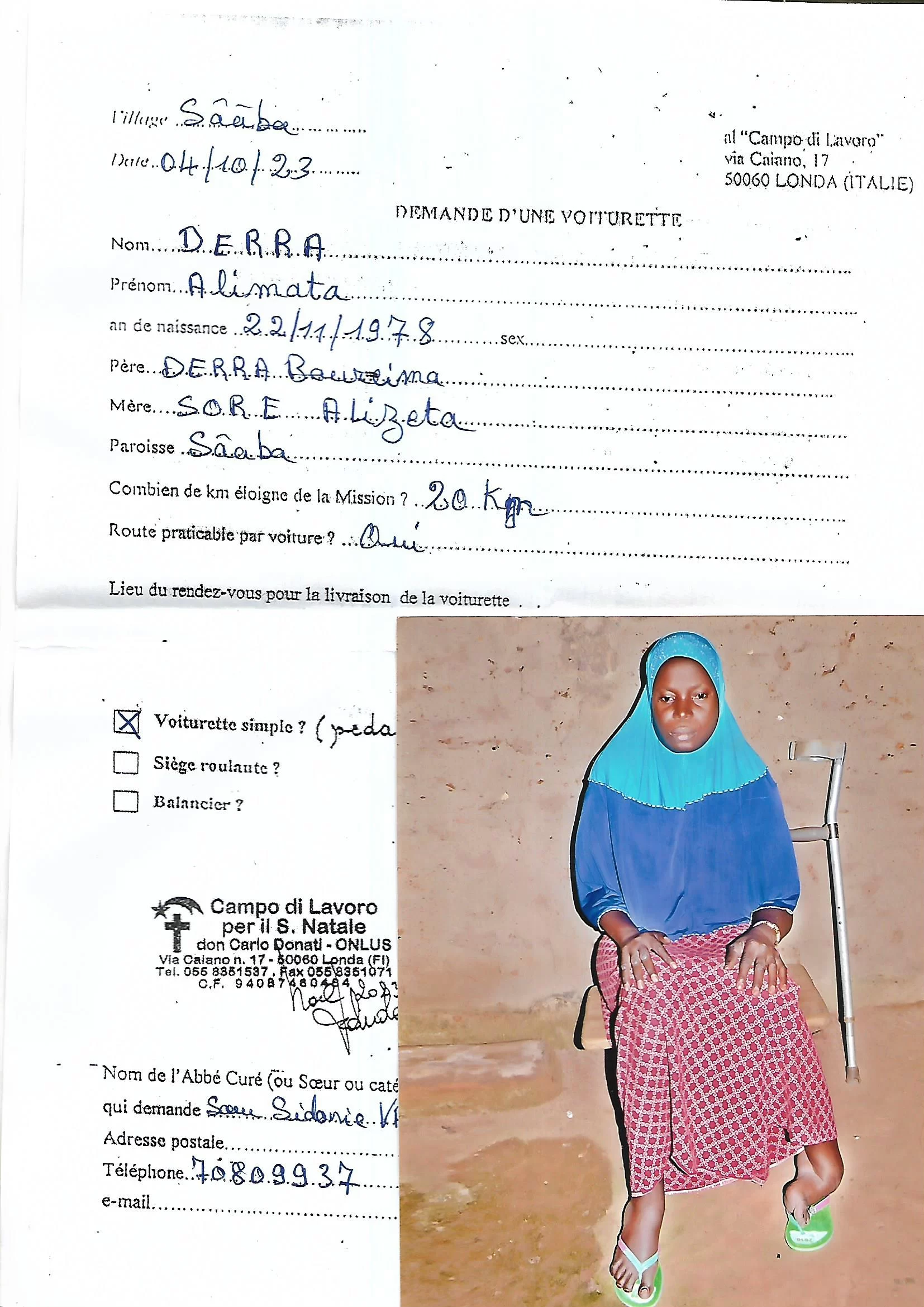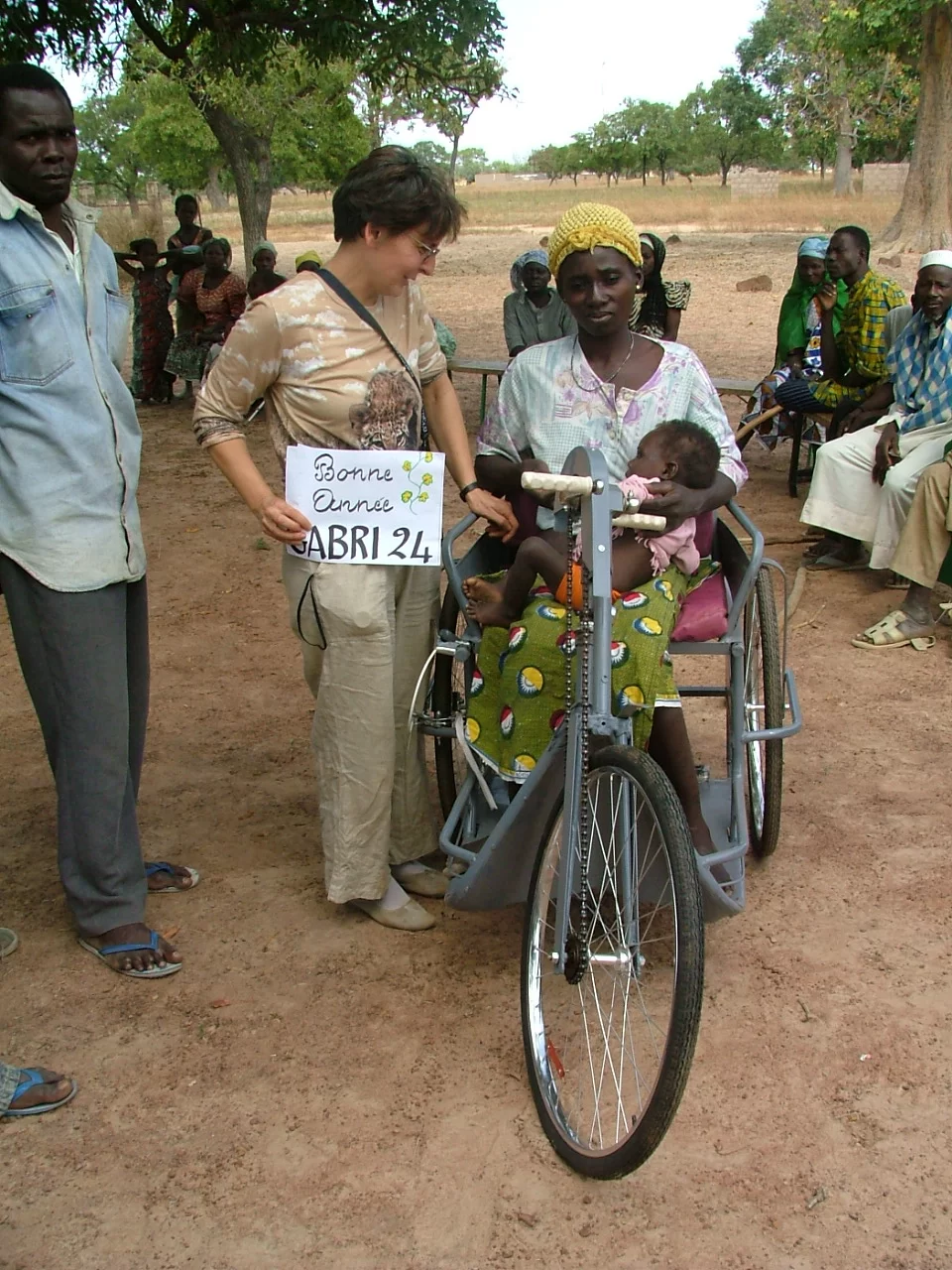 Iniziamo quindi a consegnare le carrozzine alle persone delle quali avevamo avuto la richiesta tramite la suora che ne aveva segnalato la necessità. In genere si tratta di uomini o donne più o meno giovani, comunque in età adulta, vittime del tempo nel quale ancora non era programmata alcuna vaccinazione contro la poliomielite e che dunque si erano ammalate; persone spesso costrette a vivere confinate nella propria capanna e all’interno della propria cerchia familiare. Con Franco e Paola, aiutiamo le persone a salire sulle carrozzine, cercando di far prendere loro confidenza con questa specie di bicicletta a tre ruote che si muove azionando i pedali con le braccia. L’inizio è un po’ incerto, ma in breve tempo imparano, ed è quasi sorprendente vedere come da quel giorno molte persone tornano a muoversi in autonomia, spostandosi per andare al mercato a vendere o comprare merci, recarsi alla chiesa per la Messa o al dispensario per le cure.